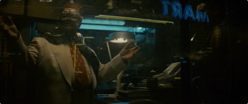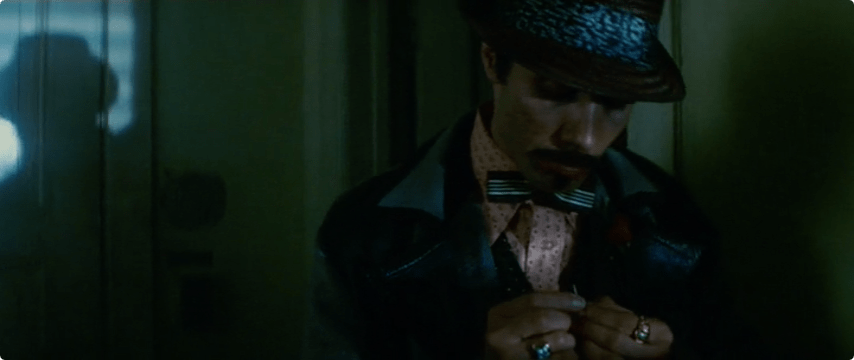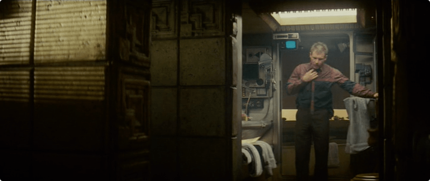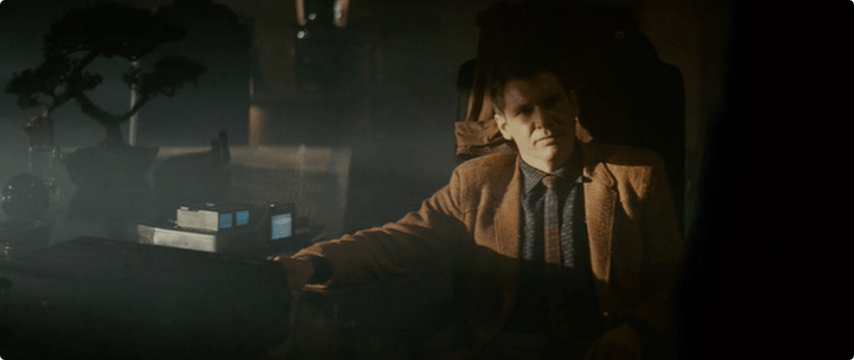In this scene we get a closer look at Deckard’s clothing: a brown sportcoat and trousers, but check out that shirt! Blue. Burgundy. Yellow or perhaps gold. And an intricate pattern across his shirt and tie.