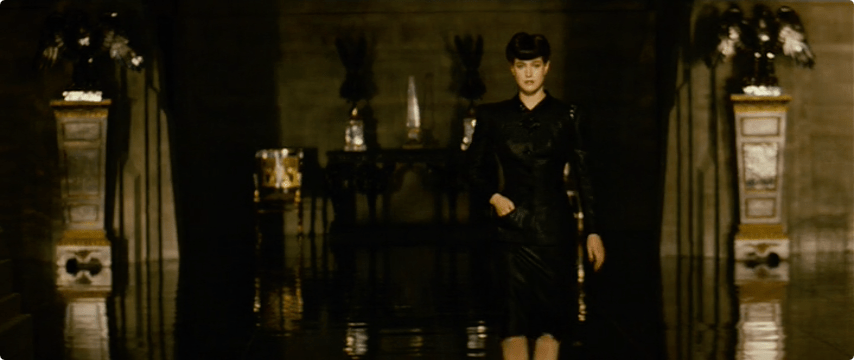 At the Tyrell offices, we meet Rachel. Black suit. Black hair. Pale, white skin.