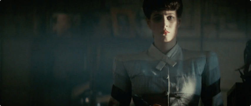 Rachel on the run, shows up at Deckard’s apartment wearing a grayscale suit. Lips still red, but her makeup is coming off.