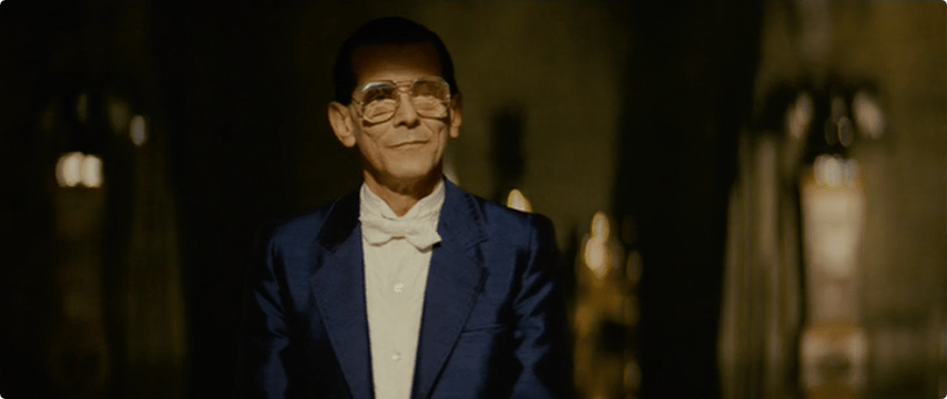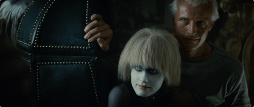 Eldon Tyrell appears suddenly wearing sumptuous royal blue and white. I’ll get back to the connection between Tyrell and his bright white wardrobe later….