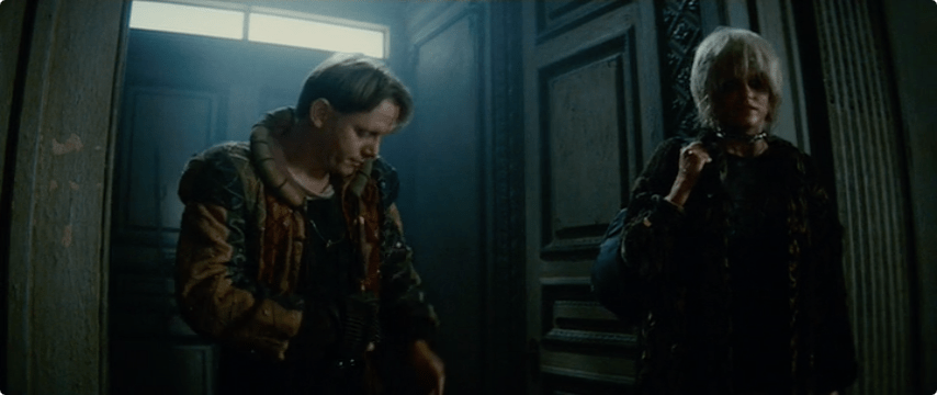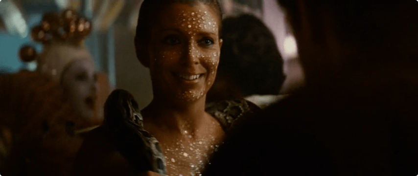 Within this vibrant scene: don’t be fooled by Zhora’s sparkles, she takes off her fake snake and silver sparkles, and changes into a (very scant) costume of black and clear!